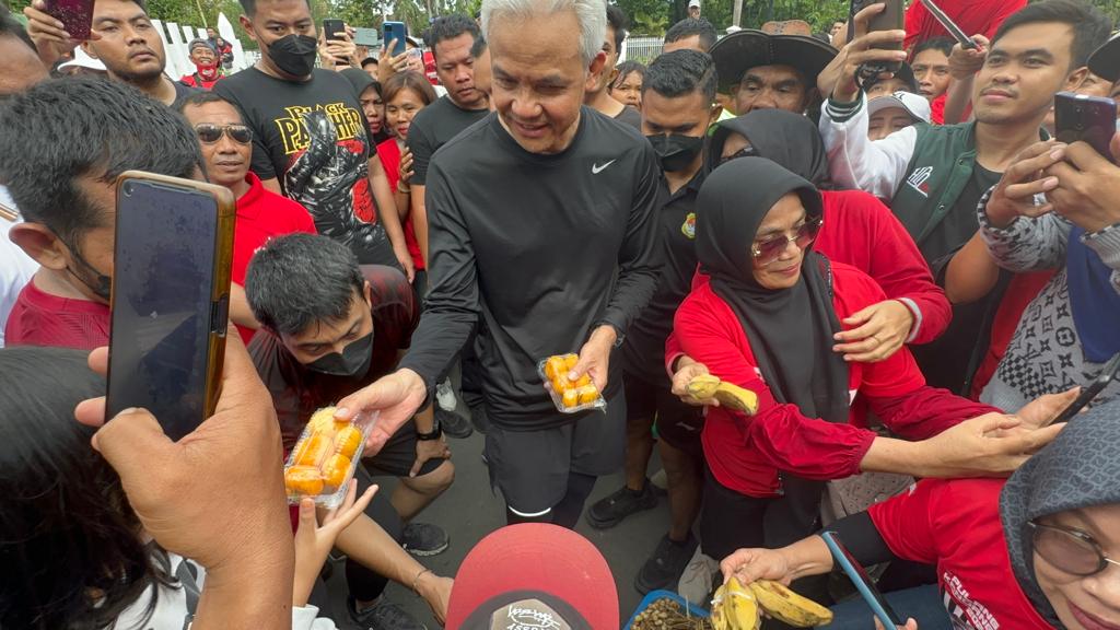 Simpatisan dan relawan Ganjar yang menyertai pun girang karena mendapat aneka jajanan rebusan dari Ganjar.
