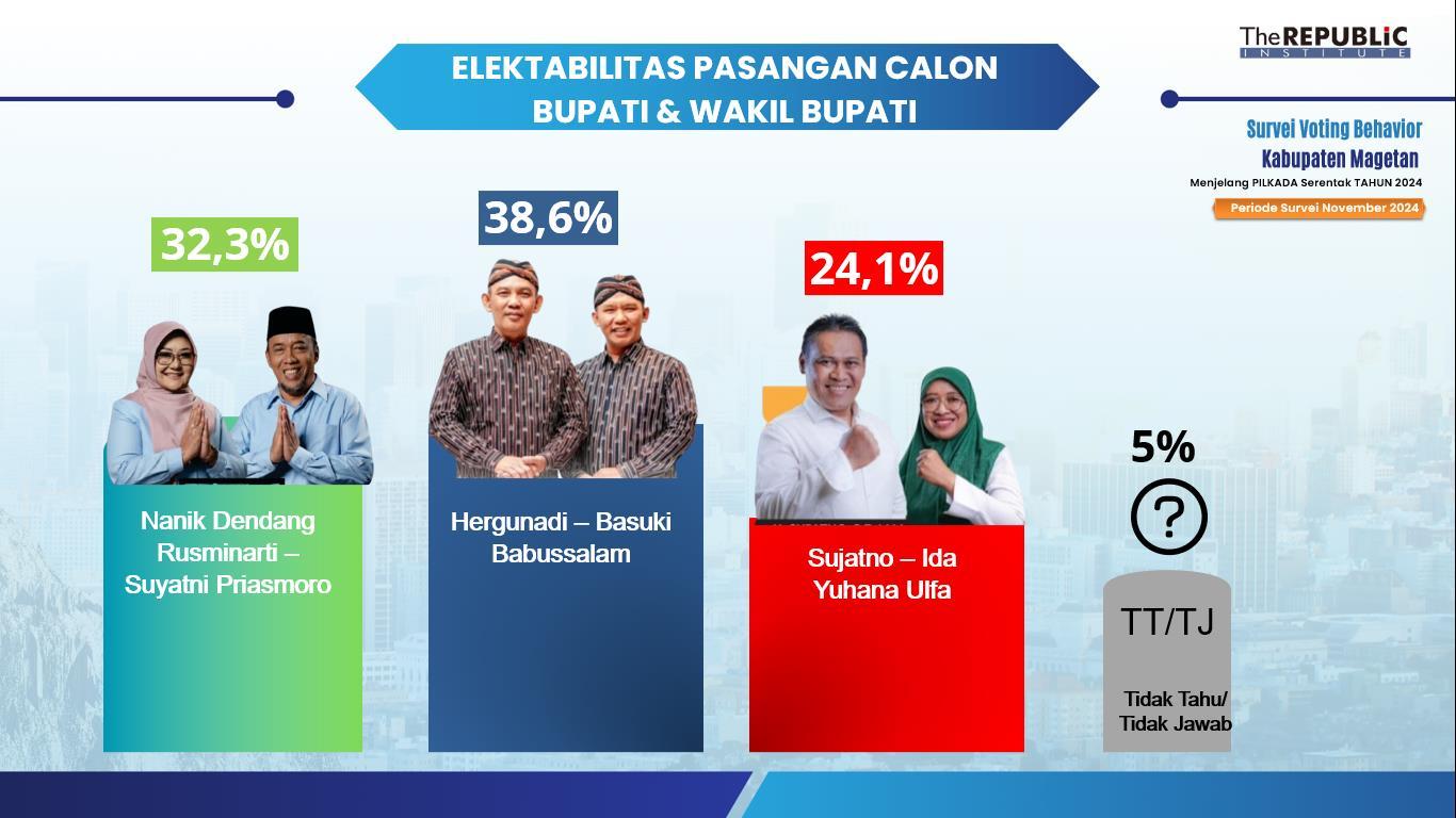 Survei terbaru dilakukan pada 14-18 November 2024 ini menyoroti popularitas dan elektabilitas tiga pasangan calon (Paslon) yang bersaing merebut kursi kepemimpinan Magetan.