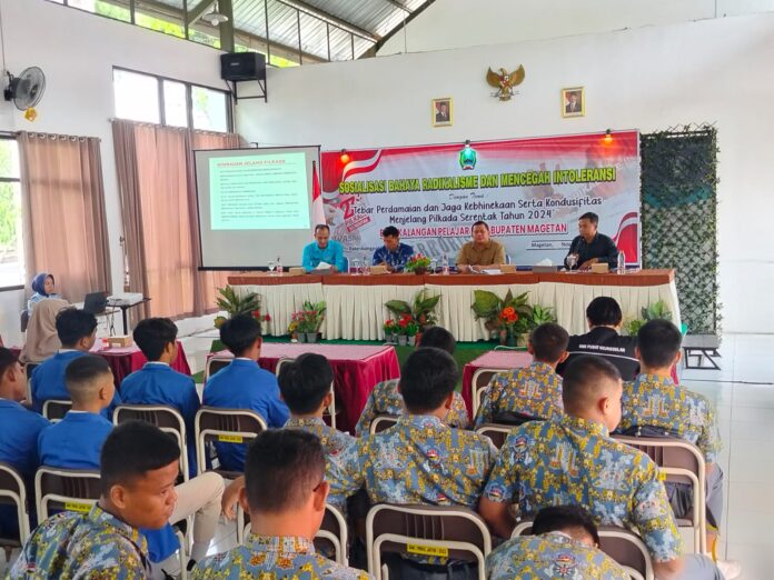MAGETAN (Blokjatim.com) – Badan Kesatuan Bangsa dan Politik (Bakesbangpol) Kabupaten Magetan gencar menggelar sosialisasi untuk mencegah radikalisme dan intoleransi bagi pelajar di Kabupaten Magetan.