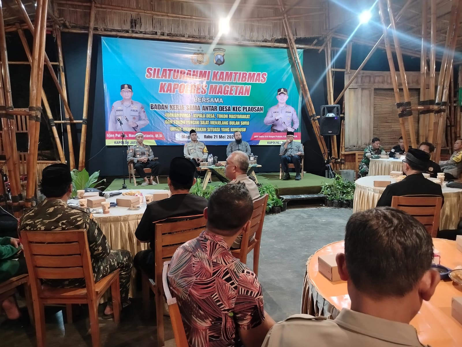“Malam ini kita berkumpul dalam rangka silaturahmi Kamtibmas dengan warga dan tokoh masyarakat. Harapan kami, melalui ajang ini bisa tercipta suasana aman, damai dan rukun, khususnya di Plaosan dan umumnya di Kabupaten Magetan. Ini juga sebagai antisipasi menjelang bulan Suro agar tidak terjadi gesekan antar elemen masyarakat,” kata Cintoko.