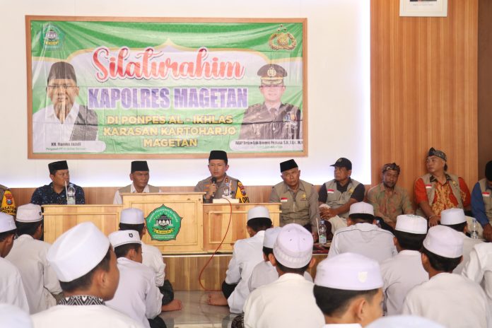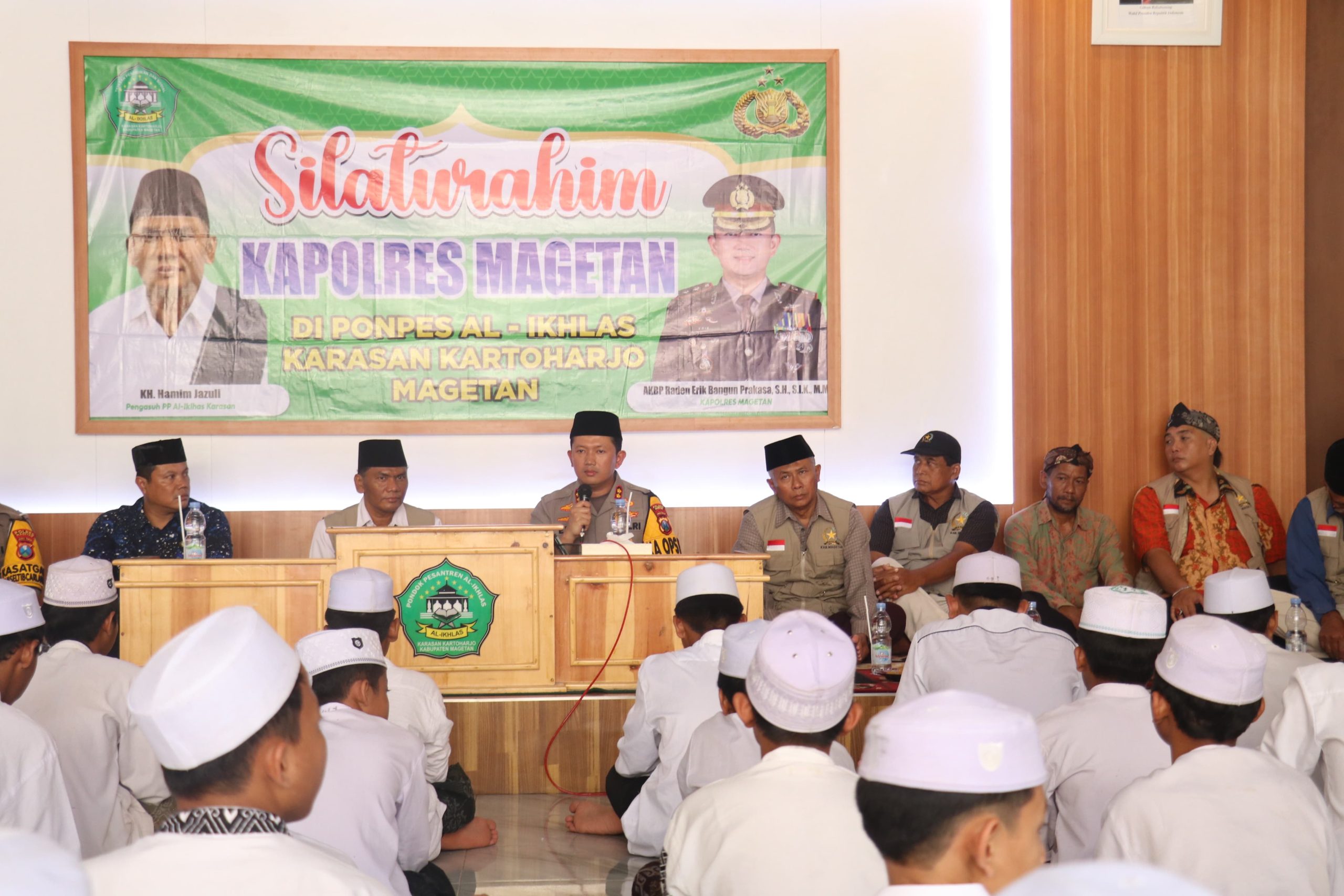 MAGETAN (Lensamagetan.com) – Bersinergis dengan para ulama untuk memajukan Magetan, Kapolres Magetan AKBP Raden Erik Bangun Prakasa, S.H., S.I.K., M.M. melaksanakan silaturahmi dengan Ketua Forum Kerukunan Umat Beragama (FKUB) Kabupaten Magetan, KH. Hamim Jazuli, S.Pd.I., yang juga merupakan pengasuh Pondok Pesantren Al Ikhlas, Karasan, Kecamatan Kartoharjo, Kamis (23/5/2025).