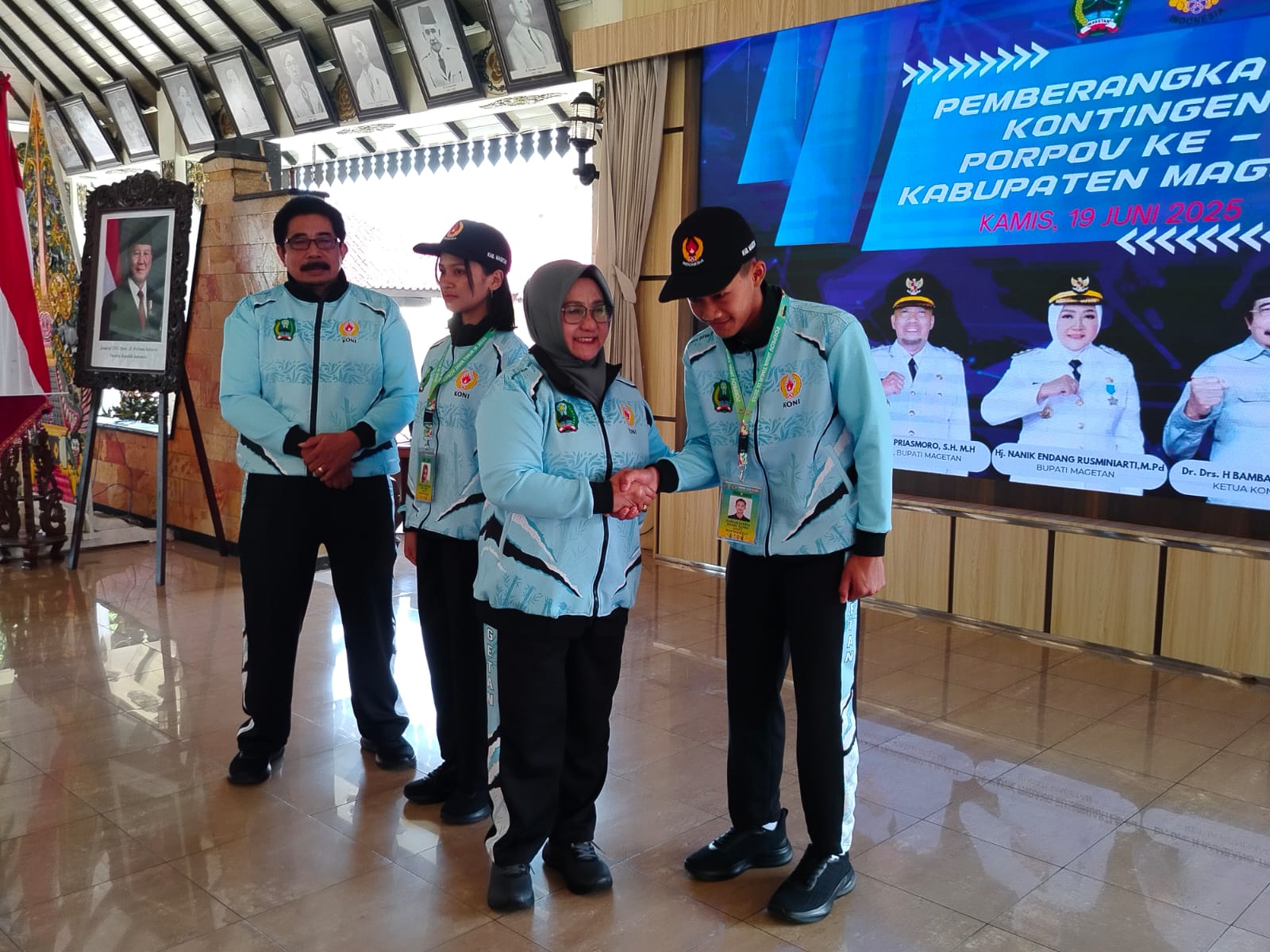 MAGETAN (Blokjatim.com) – Sebanyak 296 atlet dari Kabupaten Magetan resmi diberangkatkan untuk mengikuti ajang Pekan Olahraga Provinsi (Porprov) Jawa Timur ke-9 yang digelar di Malang Raya. Pemberangkatan secara simbolis dilaksanakan di Pendopo Surya Graha, dan dilepas langsung oleh Bupati Magetan, Nanik Endang Rusminiarti, Kamis (19/6/2025).