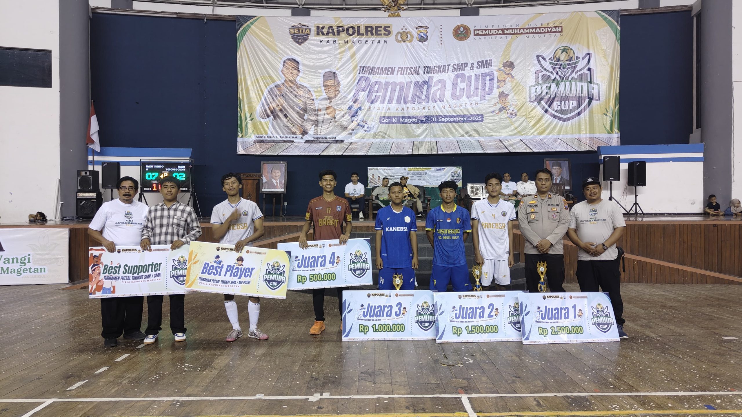 MAGETAN (Blokjatim.com) – Turnamen Futsal Pemuda Cup yang memperebutkan piala Kapolres 2025 yang digelar oleh Pemuda Muhammadiyah Magetan resmi berakhir dengan partai final yang digelar di GOR Ki Mageti, Kamis (11/9/2025).