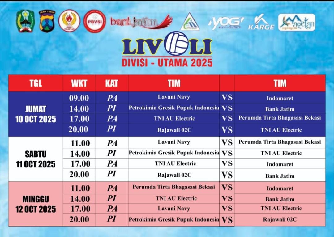 MAGETAN (Blokjatim.com) – Event akbar Livoli Divisi Utama akan akan kembali digelar di Kabupaten Magetan.Turnamen bergengsi tahun 2025 ini akan berlangsung mulai 10 hingga 19 Oktober 2025, yang menghadirkan tim-tim voli papan atas di Indonesia.