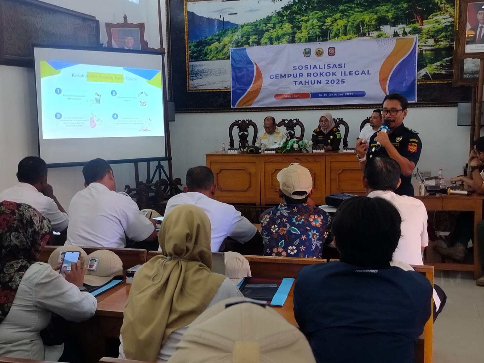 MAGETAN (Blokjatim.com) – Terus menekan peredaran rokok ilegal di Kabupaten Magetan, Satuan Polisi Pamong Praja dan Pemadam Kebakaran (Satpol PP dan Damkar) kembali menggelar sosialisasi gempur rokok ilegal, Rabu (15/10/2025).