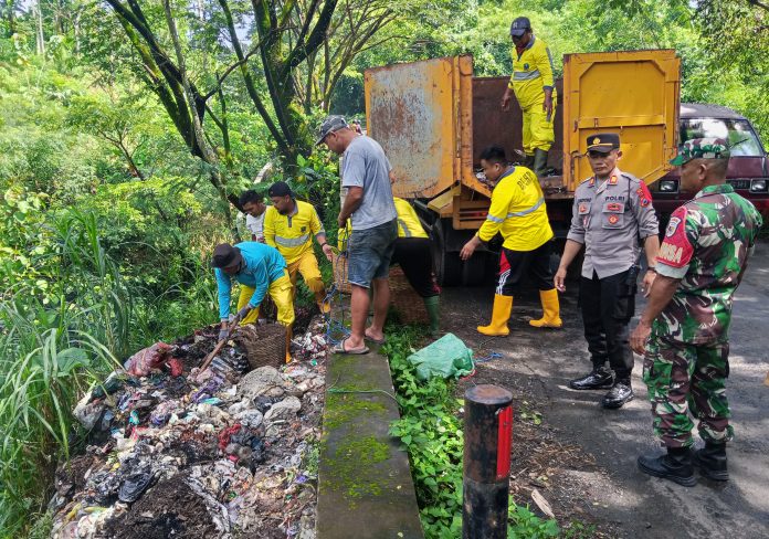 Sinergi URC DLHP Magetan, Polsek, dan Koramil Bersihkan Sampah Liar di Jembatan Blawean Desa Turi