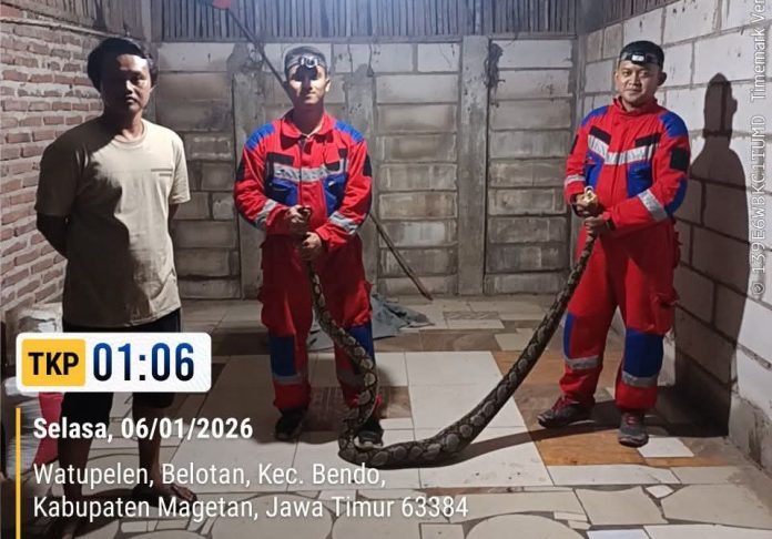 MAGETAN (BLOKJATIM.COM) – Tim Pemadam Kebakaran (Damkar) Kabupaten Magetan kembali menunjukkan kesiapsiagaan dalam penanganan gangguan hewan liar. Pada Selasa (6/1/2026) dini hari, petugas berhasil mengevakuasi seekor ular piton jenis sanca kembang berukuran besar yang menyatroni kandang milik warga di Desa Belotan, Kecamatan Bendo.