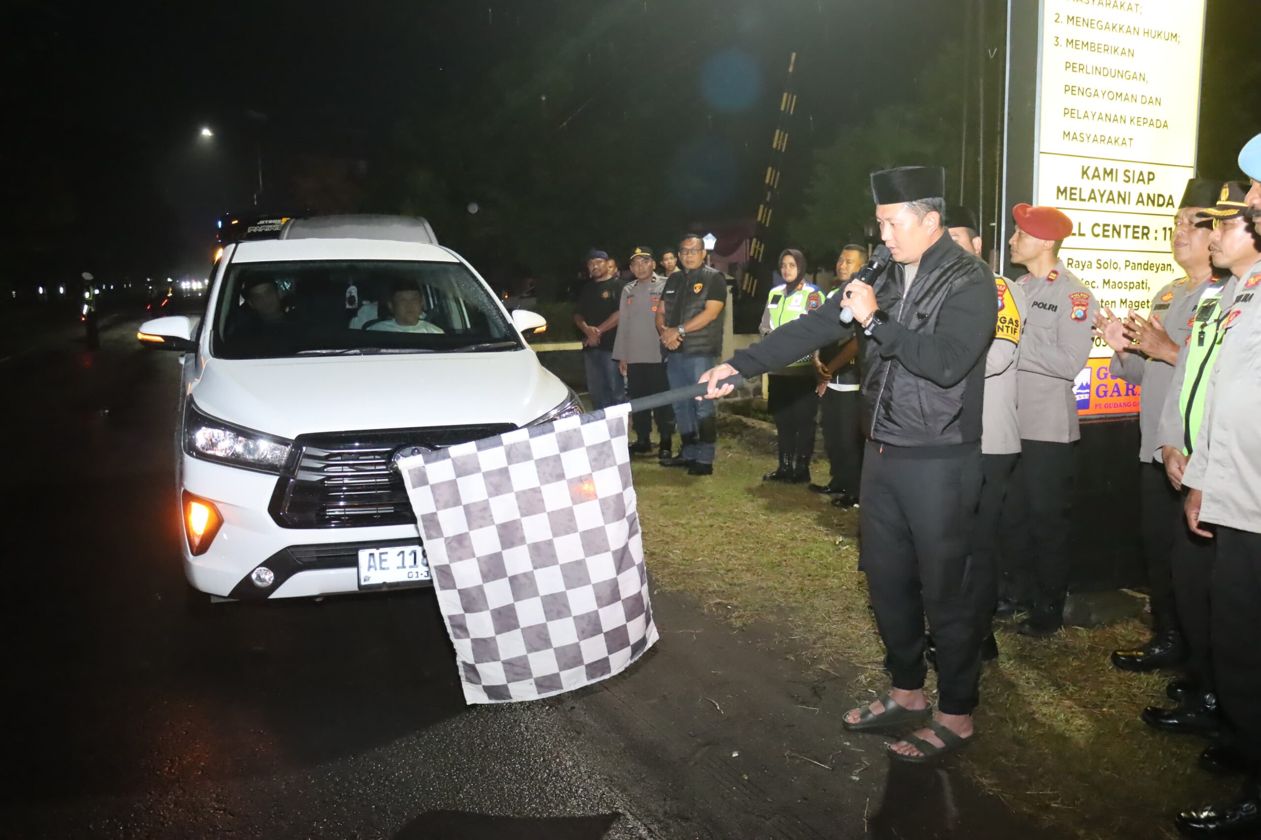 “Kami mengucapkan selamat melaksanakan kegiatan Mujahadah Kubro Peringatan 1 Abad Masehi NU Tahun 2026. Semoga seluruh jamaah diberi kelancaran, keselamatan selama perjalanan menuju lokasi hingga kembali lagi ke Kabupaten Magetan,” ujarnya.