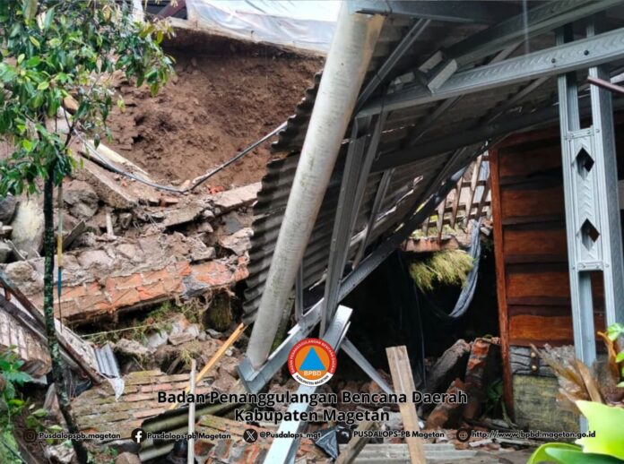 MAGETAN (BLOKJATIM.COM) – Hujan dengan intensitas ringan hingga sedang yang mengguyur wilayah Kecamatan Panekan, Kabupaten Magetan, selama kurang lebih tiga jam memicu terjadinya bencana tanah longsor pada Sabtu (7/3/2026). Insiden ini mengakibatkan talud pondasi rumah milik warga mengalami kerusakan parah dan menimbulkan satu korban luka.