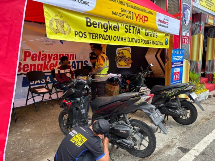MAGETAN (BLOKJATIM.COM) – Terus berupaya memberikan pelayanan maksimal bagi pemudik dan wisatawan selama libur Lebaran 2026, Polres Magetan melakukan langkah inovatif dengan menghadirkan fasilitas Bengkel Gratis SETIA. Layanan ini disiagakan tepat di Pos Terpadu Omah Jowo, jalur utama menuju kawasan wisata Telaga Sarangan, guna membantu masyarakat yang mengalami kendala teknis pada kendaraannya.